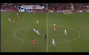 Rooney sends a long ball to Nani(blue) from the half way line thus setting up an attacking down the right
