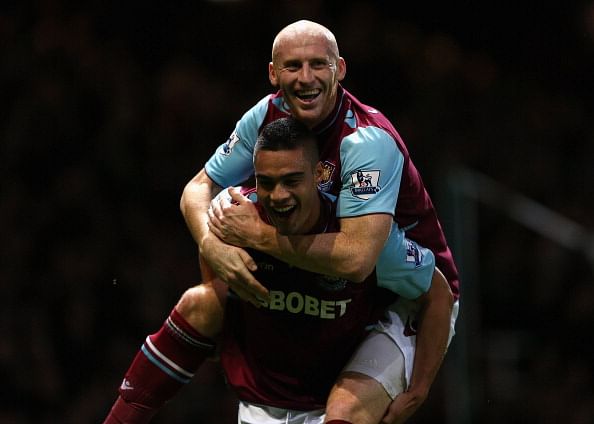 LONDON, ENGLAND – DECEMBER 09: James Collins (top) of West Ham United celebrates the own goal scored by Steven Gerrard of Liverpool with Winston Reid during the Barclays Premier League match between West Ham United and Liverpool at the Boleyn Ground on December 9, 2012 in London, England.