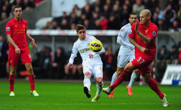 SWANSEA, WALES – NOVEMBER 25: Swansea forward Pablo Hernandez (c) has a shot at goal during the Barclays Premier League match between Swansea City and Liverpool at Liberty Stadium on November 25, 2012 in Swansea, Wales.