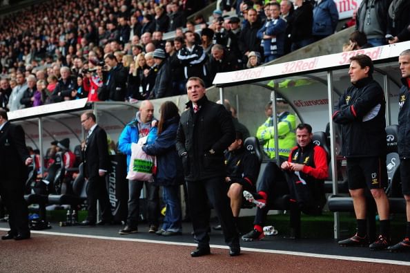 SWANSEA, WALES – NOVEMBER 25: Liverpool manager Brendan Rodgers (c) looks on before the Barclays Premier League match between Swansea City and Liverpool at Liberty Stadium on November 25, 2012 in Swansea, Wales.
