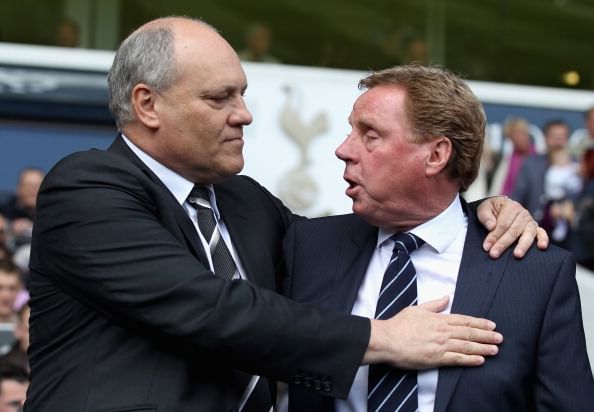 LONDON, ENGLAND – MAY 13: Fulham manager Martin Jol and Tottenham Hotspur manager Harry Redknapp greet each other ahead of the Barclays Premier League match between Tottenham Hotspur and Fulham at White Hart Lane on May 13, 2012 in London, England. (Photo by Clive Rose/Getty Images)