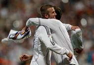 MADRID, SPAIN – JUNE 17: David Beckham (L) of Real Madrid celebrates after Real won the Primera Liga after beating Mallorca 3-1 in the Primera Liga match at the Santiago Bernabeu stadium on June 17, 2007 in Madrid, Spain.