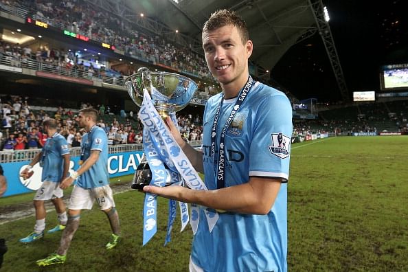Edin Dzeko #10 of Manchester City poses with trophy after defeating Sunderland during the Barclays Asia Trophy Final match between Manchester City and Sunderland at Hong Kong Stadium on July 27, 2013 in So Kon Po, Hong Kong. (Photo by Chris McGrath/Getty Images for FA Premier League)