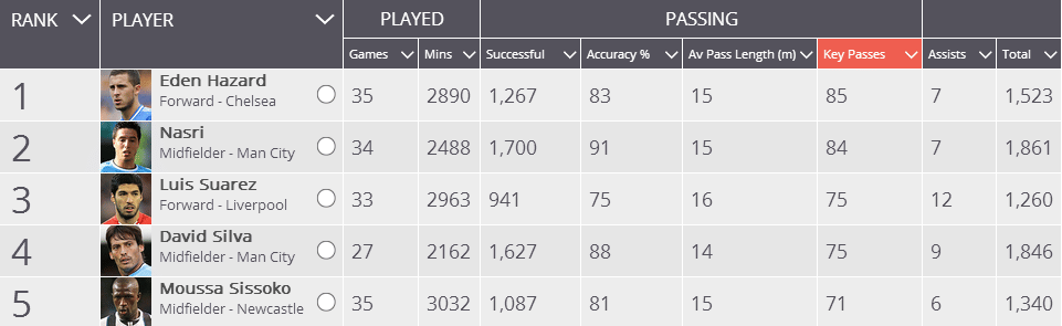 In the 2012/13 season he completed just 63 from 128. His skill on the ball is edging him towards the complete package. As Hazard matures, he will only get better if he continues in the same vein. Time is still on his side, although his inexperience showed when he spoke out against his manager following the Champions League defeat to Atletico Madrid.