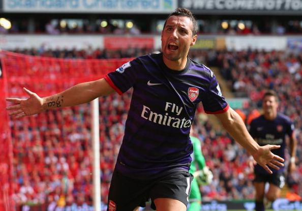 Santi Cazorla celebrates after scoring the second goal during the Barclays Premier League match against Liverpool at Anfield on September 2, 2012 in Liverpool, England. (Getty Images)