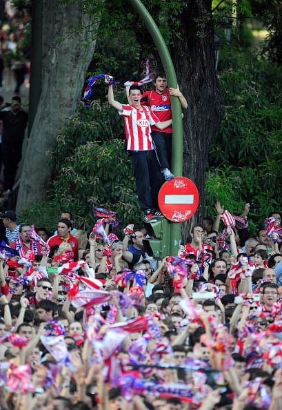 MADRID, SPAIN – MAY 10: Atletico Madrid fans celebrate a day after they won the Europa League Final on May 10, 2012 in Madrid, Spain. Atletico beat Athletic Bilbao 3-0 in the final in Bucharest.