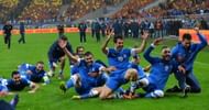 Greek national football team’s players celebrate qualifying on November 19, 2013 in Bucharest after the FIFA 2014 World Cup playoff football match Romania vs Greece.