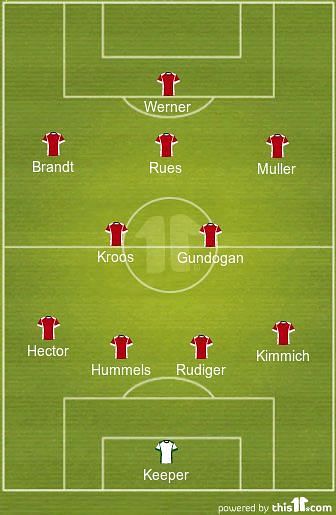 Probable starting XI: Neuer; Kimmich, Boateng, Rudiger, Hector; Gundogan, Kroos; Muller, Reus, Brandt; Werner.