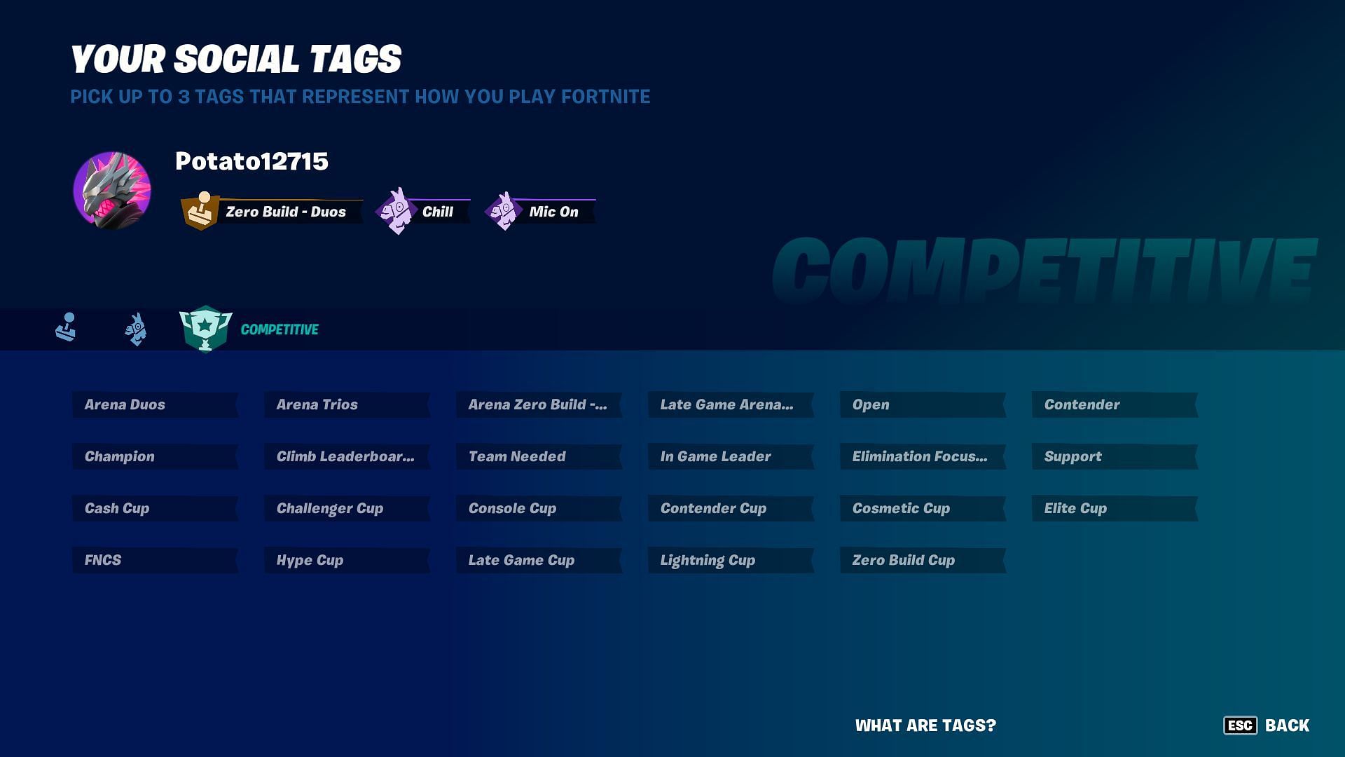 "Add social tags to your profile to show other players how you play Fortnite and to get recommendations for experiences. Add a tag, then check the Looking For Party tab to find players with similar tags."