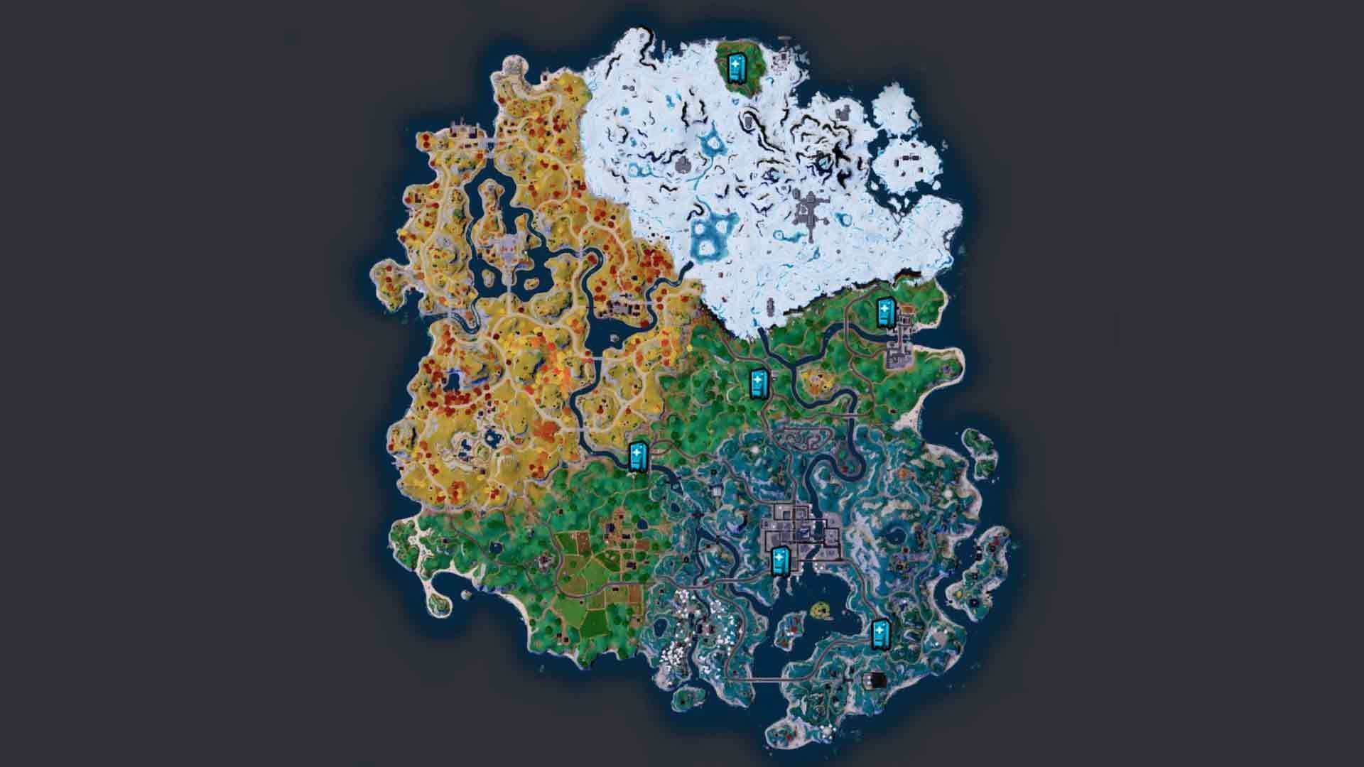The image above reveals the locations of Weapon-o-Matic Vending Machines. Although every Fortnite biome has at least one such machine, certain locations, such as Mega City or The Citadel, have many more.