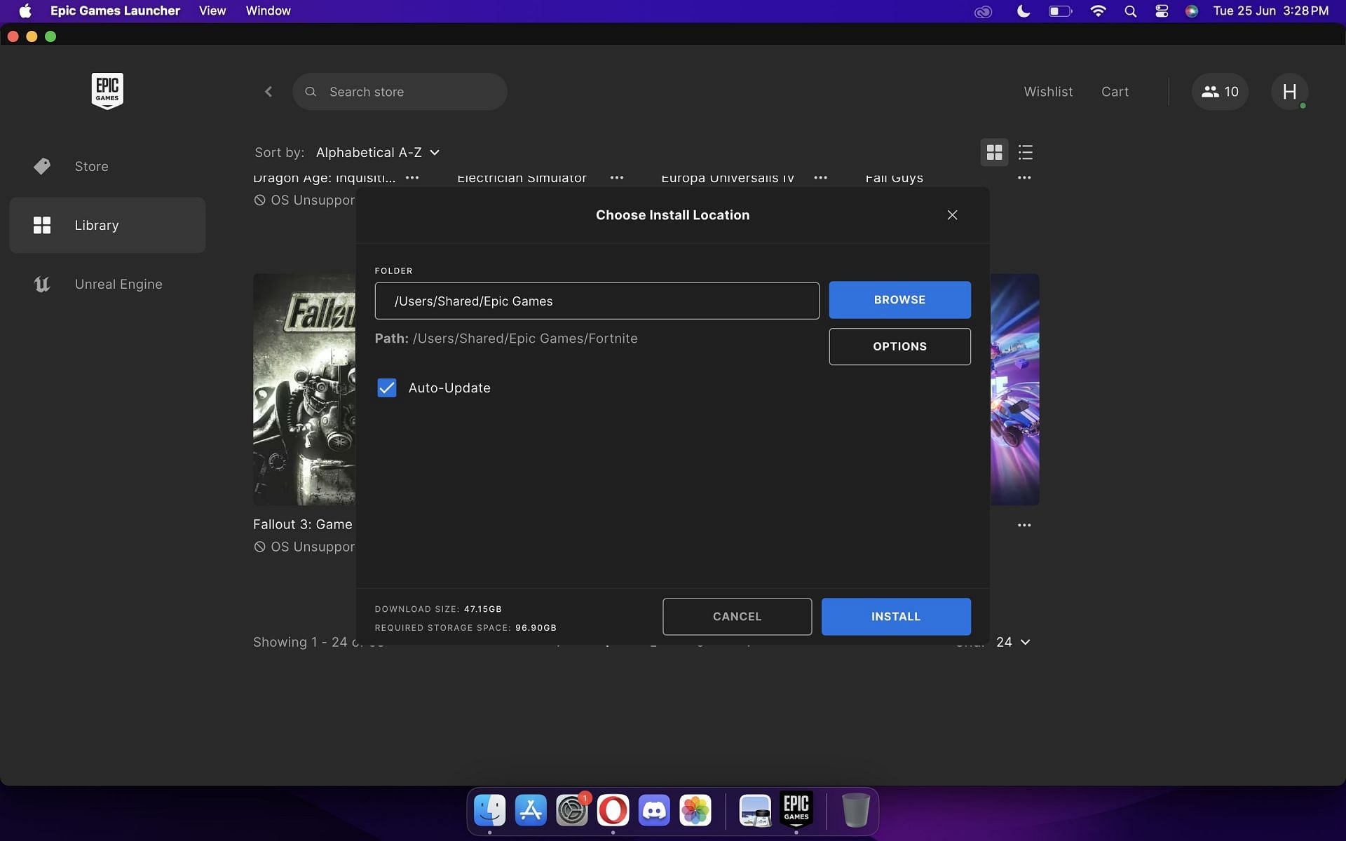 Head on to the "Library" tab on the left side of the Epic Games Launcher and navigate to Fortnite. Click on Install and an Installation Window will appear; select the location where you would like to install the game. Wait for the game to download. You have now successfully installed Fortnite on Mac.