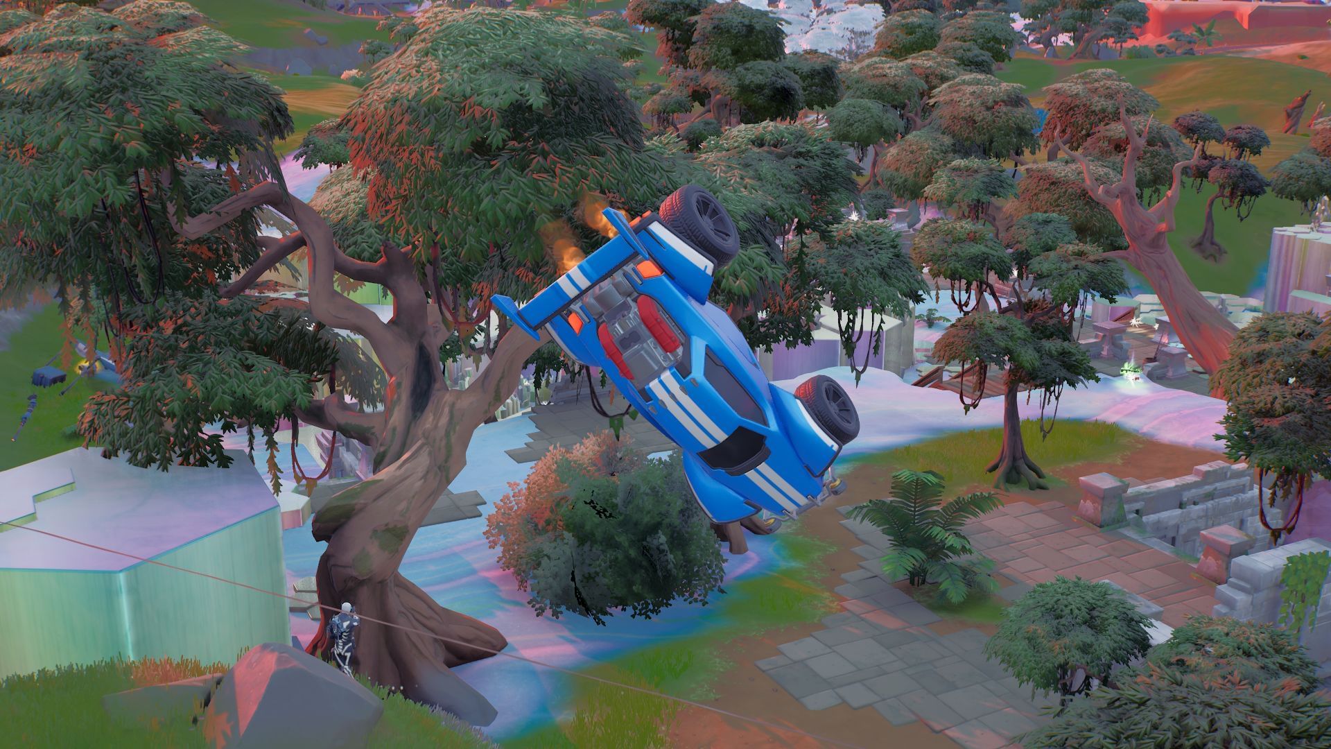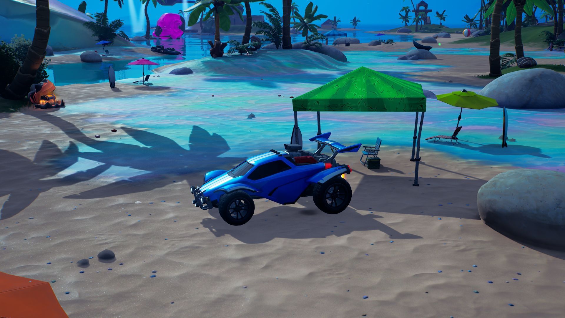 Players will want to land just south of The Last Legs (broken Foundation monument) on the beachhead. Parked next to a tent, an Octane vehicle from Rocket League should come into sight. Since they have fixed spawn locations, 100% of the time one will be found here.
