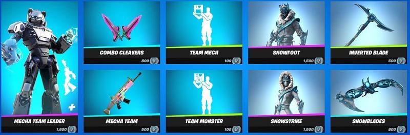 The Mecha Team Leader set can be found in the Fortnite item shop, along with skins belonging to the Snowclan set. There are eight different skins from the Permafrost set as well.