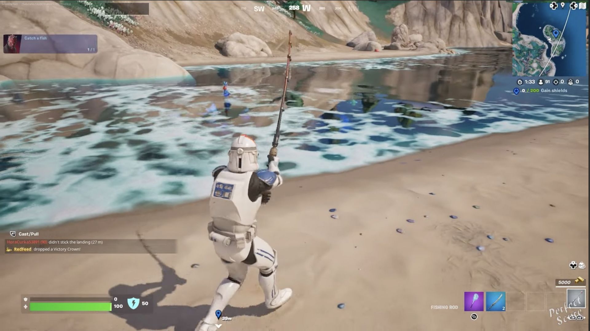 The next challenge is pretty straightforward as well. All you need to do is catch a single fish. This can be done anywhere. Fortunately, there's plenty of water near the two locations you visited for the previous task. Find a fishing rod and a fishing hole, and catching a fish won't require more than a few moments.