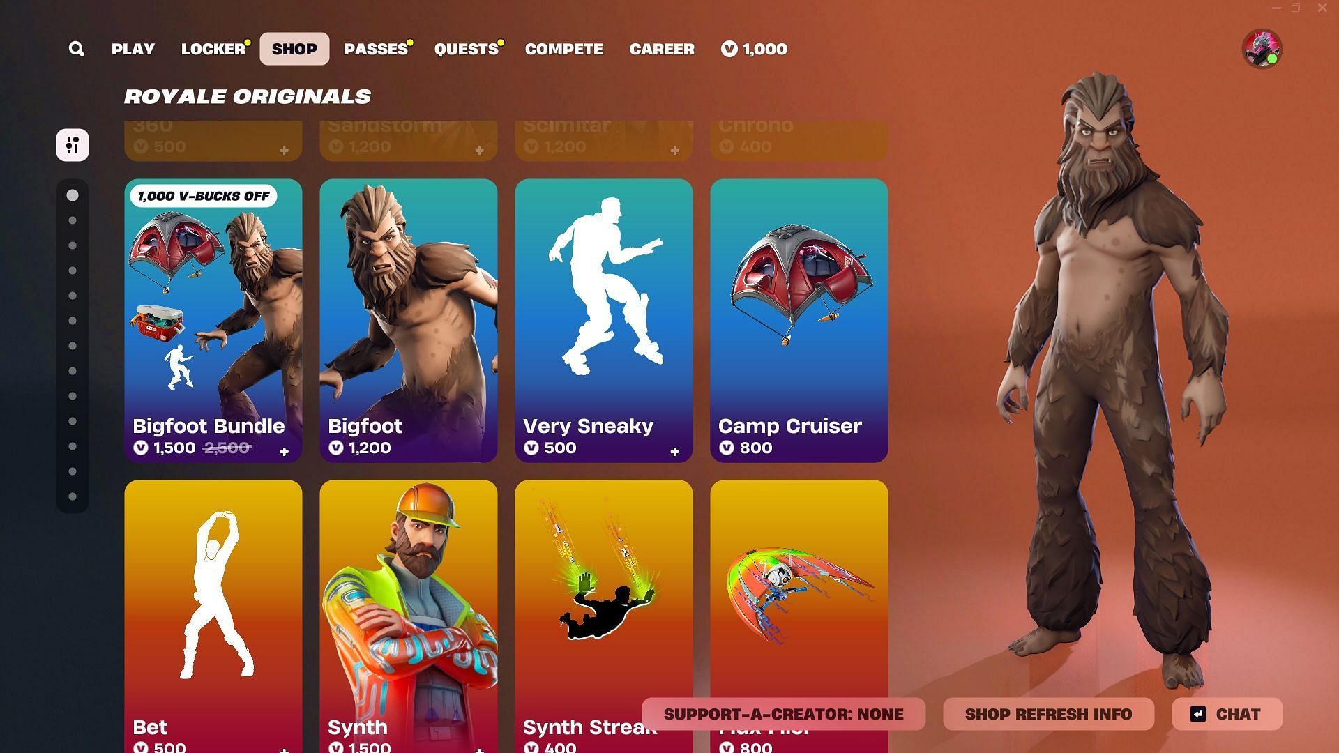 As of March 4, 2025, Bigfoot skin in Fortnite is listed in the Item Shop under the "Royale Originals" Tab. It can be purchased via the Bigfoot Bundle and is associated with the Bigfoot Set.