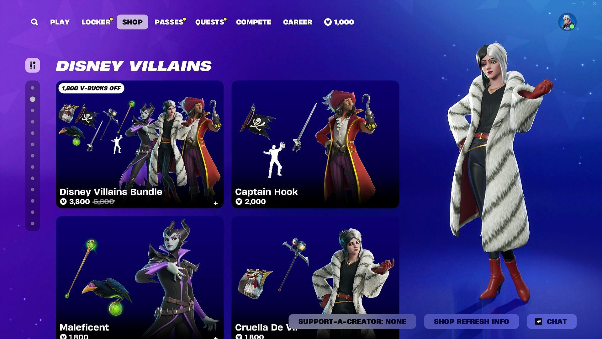 As of February 25, 2025, Captain Hook, Maleficent, and Cruella De Vil (Disney Villains) skins in Fortnite are listed in the Item Shop under the "Disney Villains" Tab. It can be purchased via the Disney Villains Bundle and is associated with the Disney Villains Set.