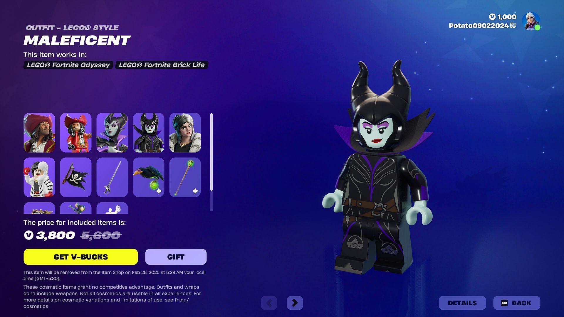 Maleficent (Outfit) + Maleficent (LEGO Outfit), Maleficent's Raven (Back Bling), and Maleficent's Scepter (Pickaxe) can be bought together for 1,000 V-Bucks. Cruella De Vil (Outfit) + Cruella De Vil (LEGO Outfit), Haute Hangbag (Back Bling), and De Vil's Grille (Pickaxe) can be bought together for 1,800 V-Bucks.