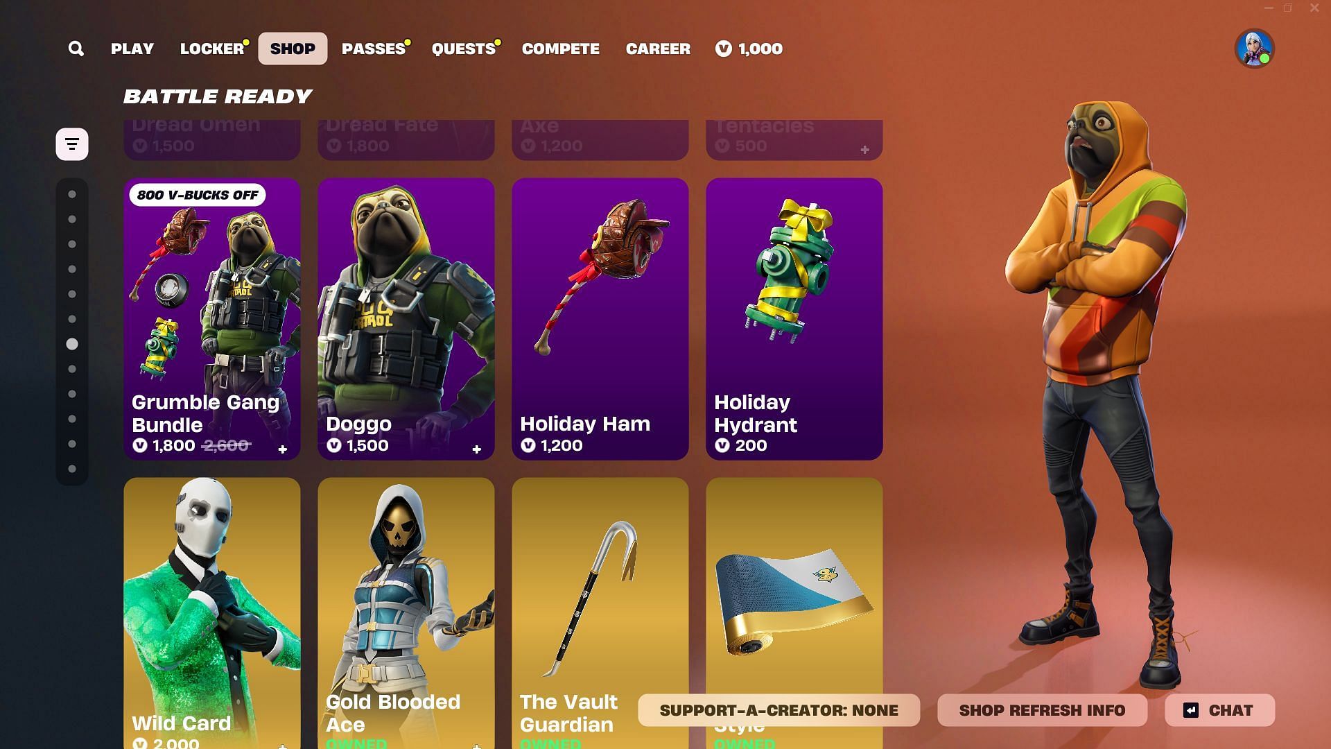 As of March 12, 2025, the Doggo skin in Fortnite is listed in the Item Shop under the "Battle Ready" Tab. It can be purchased via the Grumble Gang Bundle and is associated with the Grumble Gang Set.