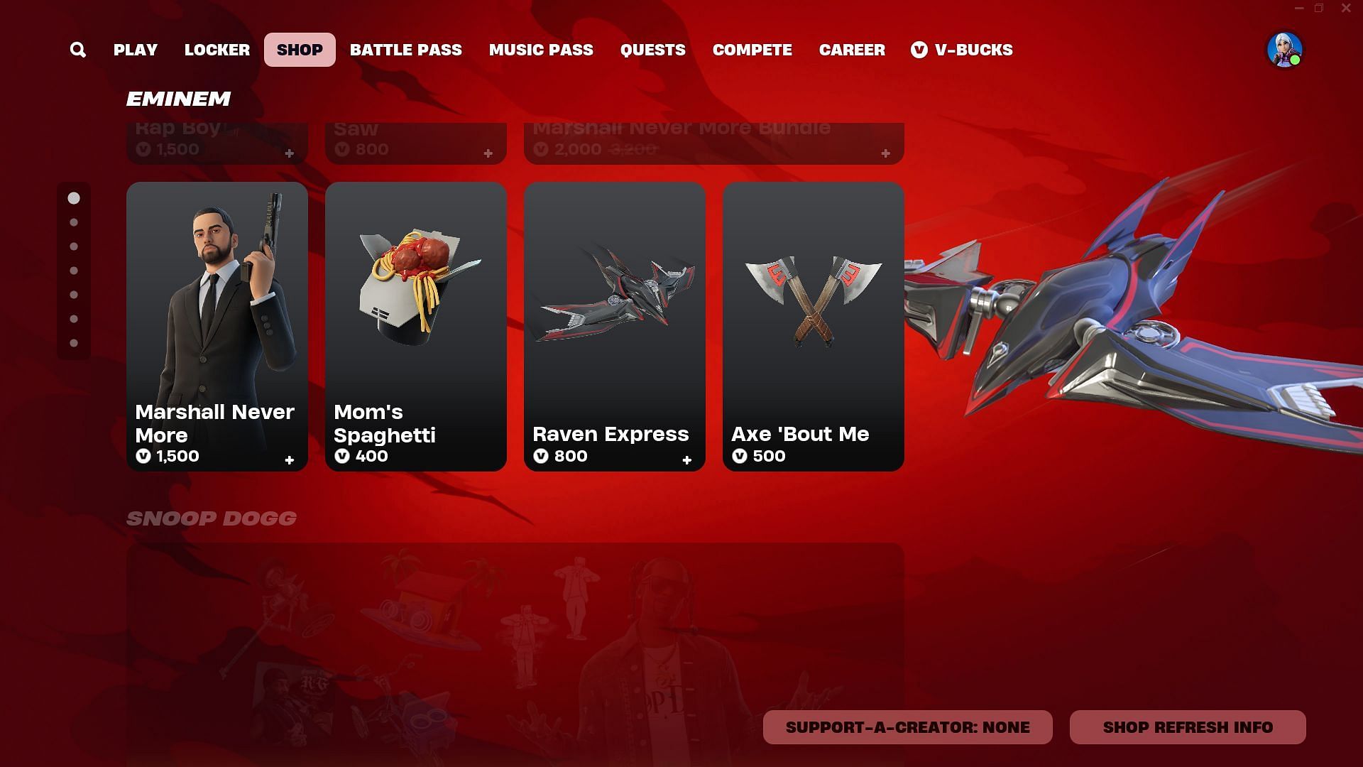 Marshall Never More (Outfit + Selectable Styles) and Raven's Stare (Back Bling) can be purchased together for 1,500 V-Bucks. Mom's Spaghetti (Back Bling) can be purchased for 400 V-Bucks. Axe 'Bout Me (Pickaxe) and Raven Express (Glider + Selectable Styles) can be purchased for 500 and 800 V-Bucks respectively.