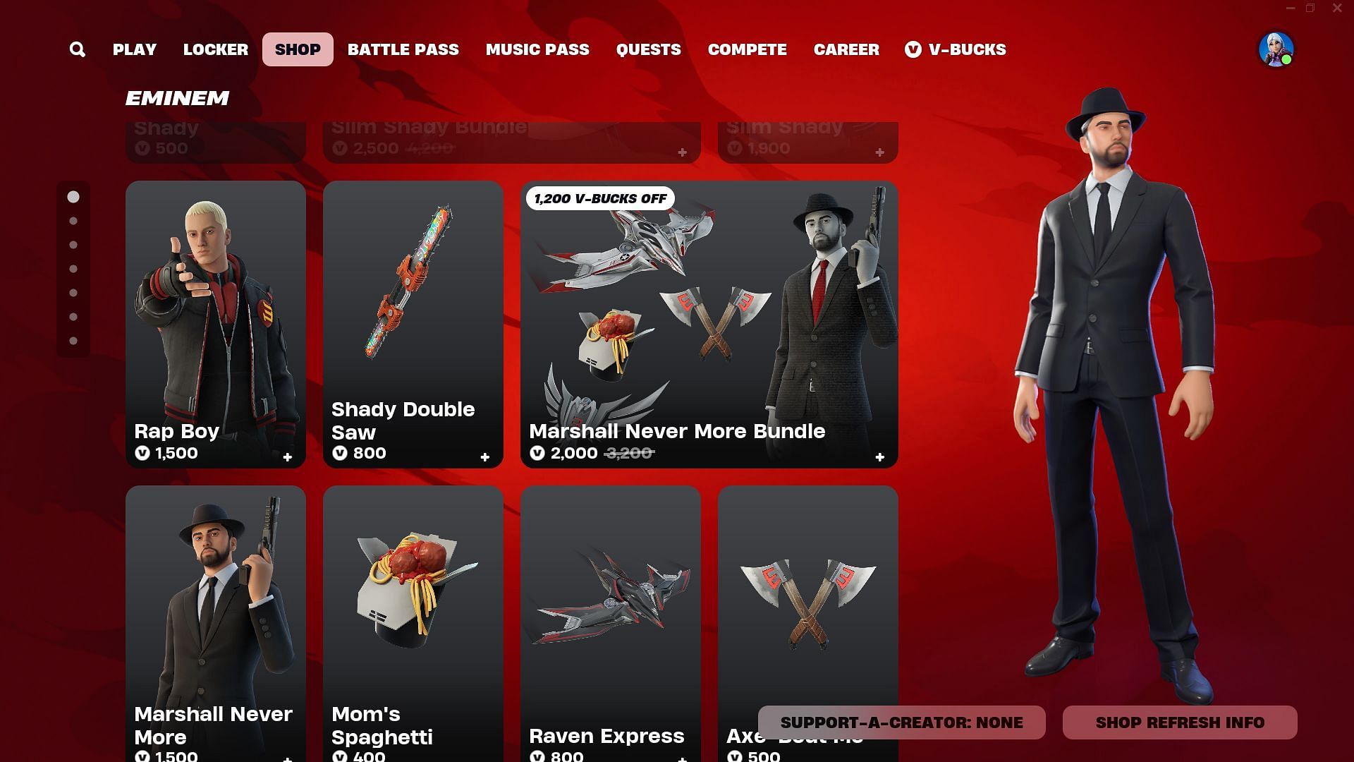 Slim Shady (Outfit + Selectable Styles), Mask Up (Built-In Emote), and Shady Boombox (Back Bling) can be purchased together for 1,900 V-Bucks. Rap Boy (Outfit + Selectable Styles) can be purchased for 1,500 V-Bucks. Shady Double Saw (Pickaxe) can be purchased for 800 V-Bucks.
