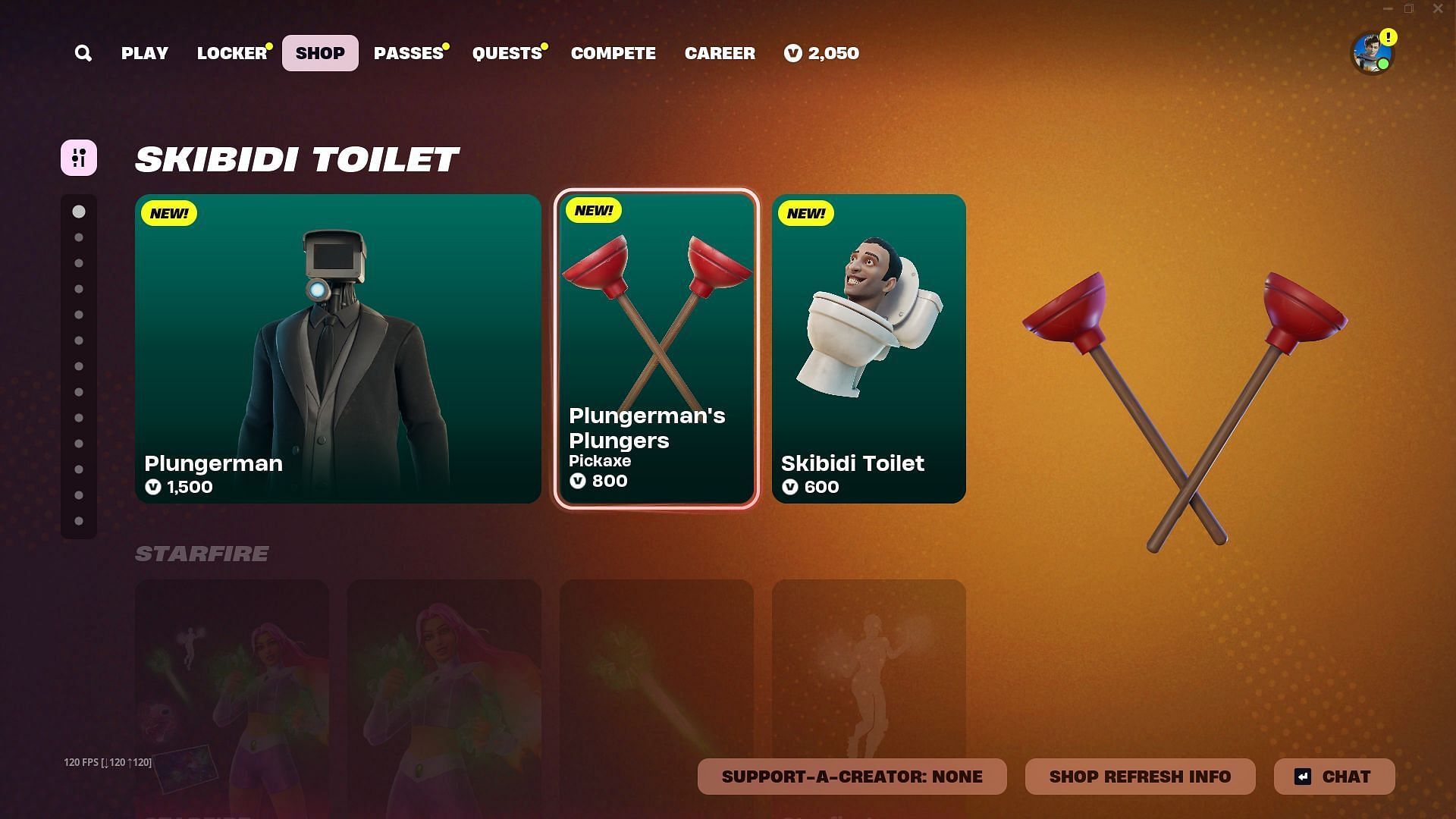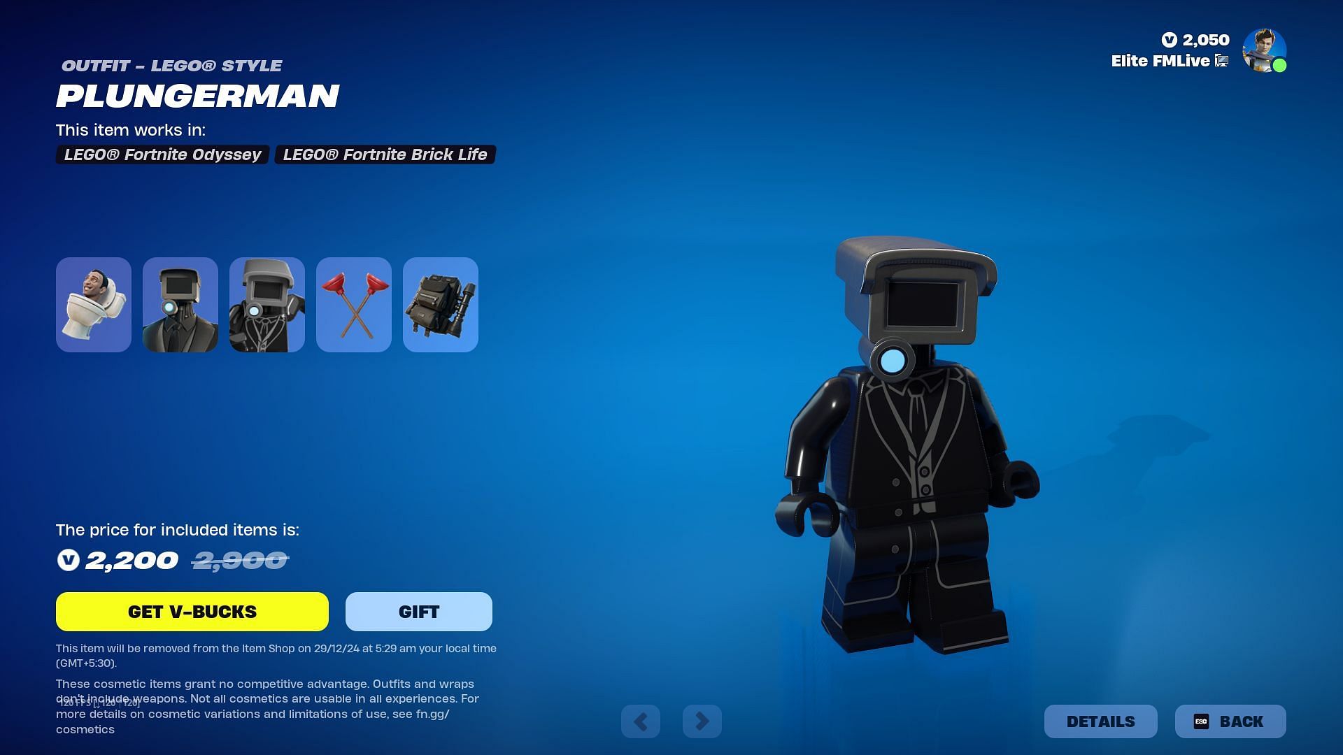 Plungerman (Outfit) + Plugerman (LEGO Outfit) and Skibidi Pack (Back Bling) can be purchased together for 1,500). Plungerman's Plunger (Pickaxe) and Skibidi Toilet (Back Bling) can be purchased separately for 800 and 600 V-Bucks respectively.