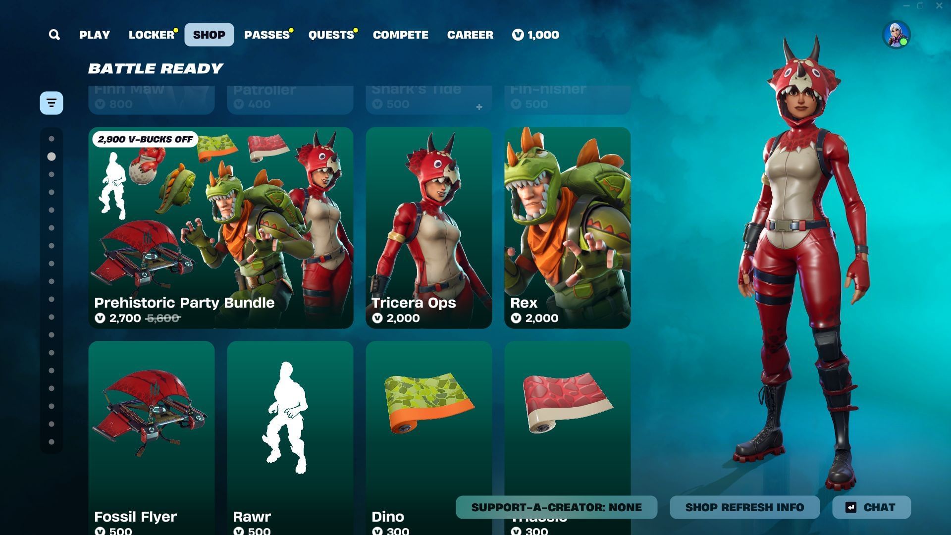 As of March 21, 2025, the Tricera Ops and Rex skins in Fortnite are listed in the Item Shop under the "Battle Ready" Tab. It can be purchased as part of the Prehistoric Party Bundle and is associated with the Dino Guard Set.