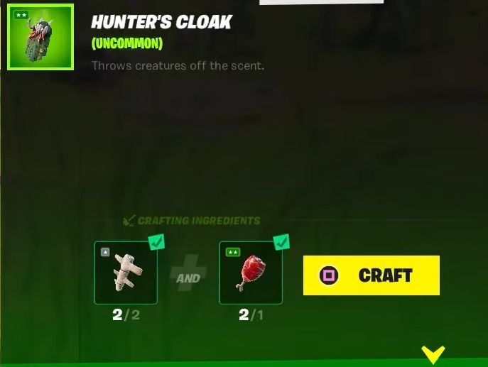 To craft Hunter's cloak in Fortnite, players will require two pieces of bone and one piece of raw meat. These resources can be obtained by hunting any form of wildlife in Fortnite Season 6.
