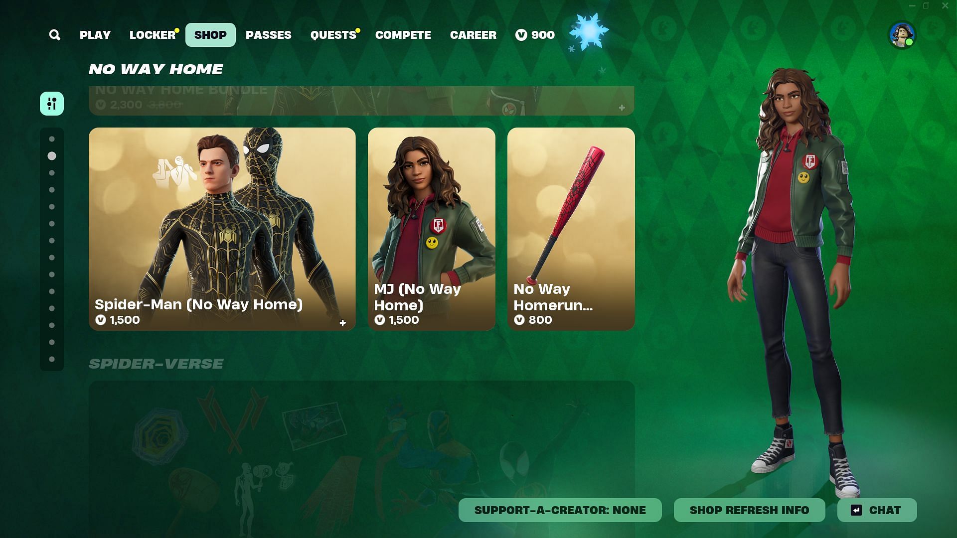 Spider-Man No Way Home (Outfit + Built-In + Selectable Styles) + Spider-Man No Way Home (LEGO Style), Amazing Unmasking (Built-In Emote), and Spider-Man Icon (Back Bling) can be purchased together for 1,500 V-Bucks. MJ (Outfit) and MJ's Bookbag (Back Bling) can be purchased together for 1,500 V-Bucks. No Way Homerun Hitter (Pickaxe) can be purchased for 800 V-Bucks.