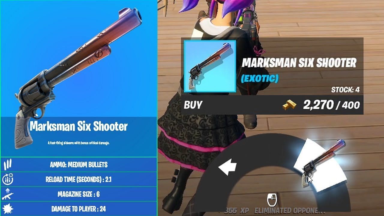 This double-barreled shotgun is also among the recurring exotic weapons in Fortnite. It is infamous for its recoil, sending the player flying back. It deals damage of 120 per shot and has a headshot multiplier of 1.25x. It can be purchased from Jonesey at the Joneses.