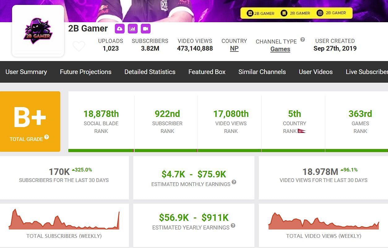 2B Gamer’s monthly income lies between $4.7K and $75.9K, as per the Social Blade website.