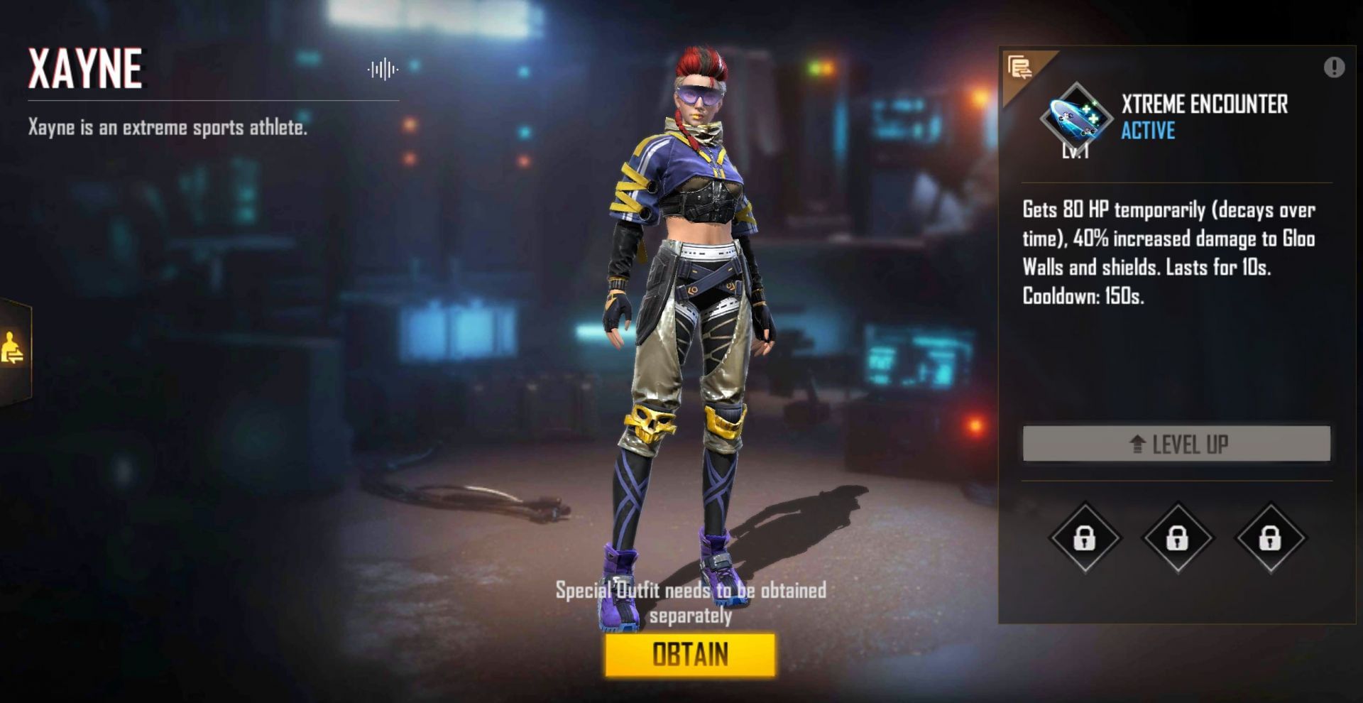 After the buff, Xayne is one of the female characters in the game, and players should consider getting her for free. This character’s Xtreme Encounter provides 80 temporary HP, which decays over time at the first level. Moreover, players inflict 80% increased damage on gloo walls and shields for the next 15 seconds, with the cooldown set at 150 seconds.