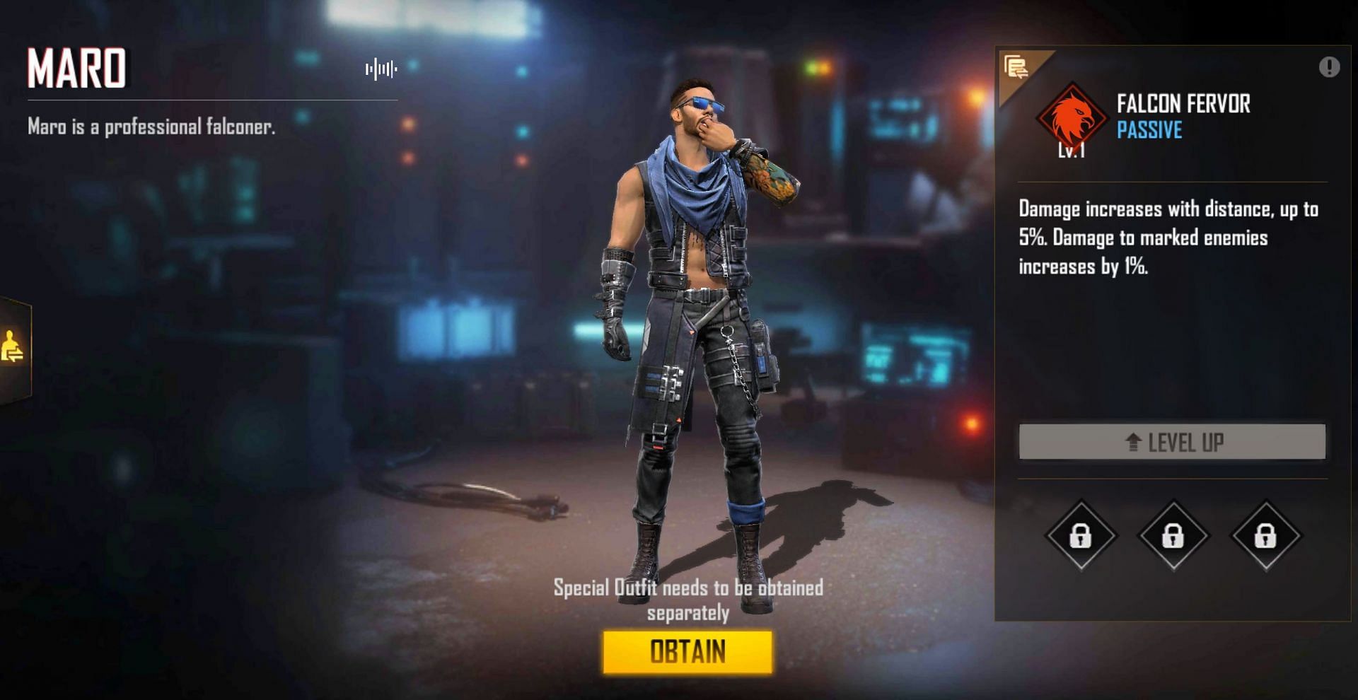 Maro was added after a collaboration with Mohamed Ramadan. The character’s ability in Free Fire increases the damage with distance, up to 5%, and enhances the damage to marked enemies by 1%.