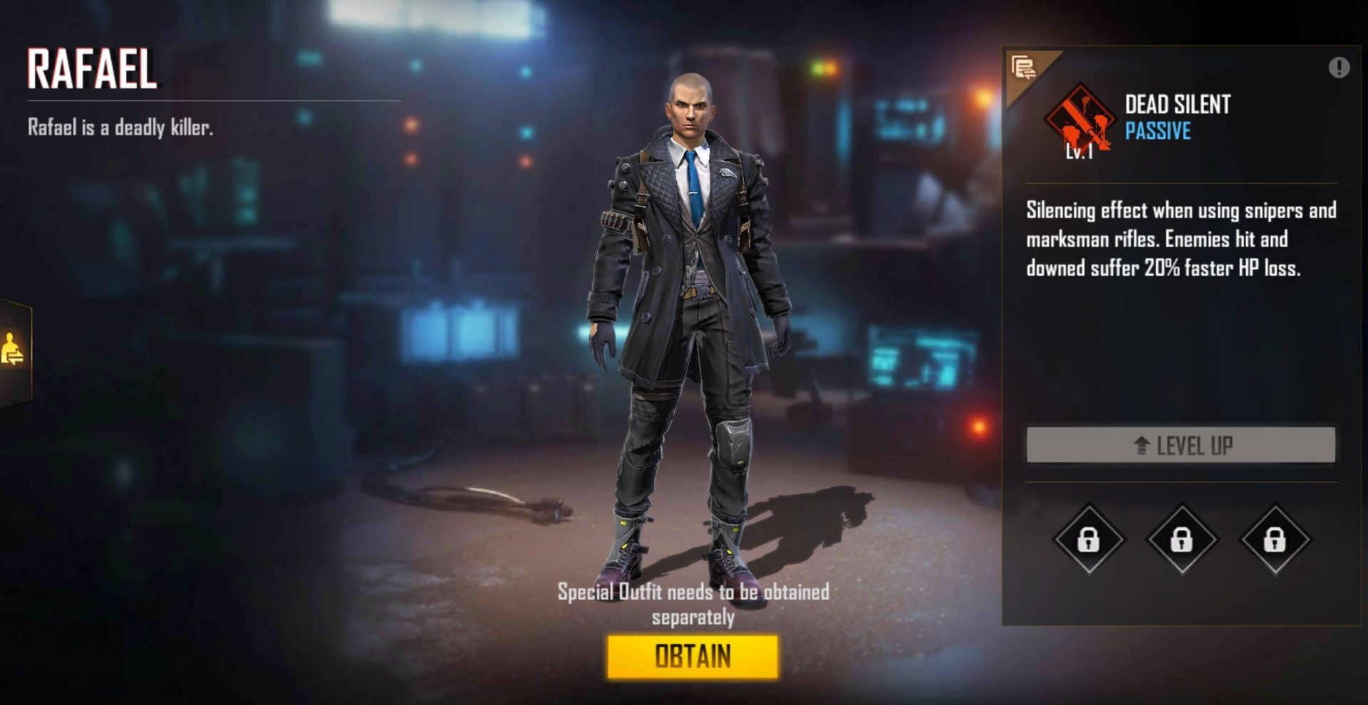 The final piece of this combination is Rafael, and the Dead Silent ability gives a silencing effect when using snipers and marksman rifles in Free Fire. Furthermore, the enemies they hit and down suffer 20% faster HP loss.