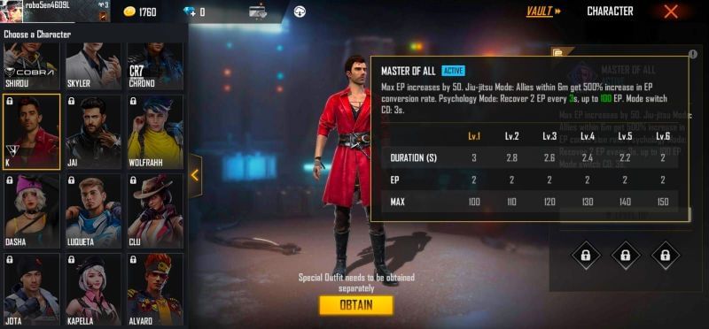 K has an active ability called Master of All and can easily be termed one of the best among Free Fire characters. Players can K's Master of All, which can help in an increase in Max EP by 50.