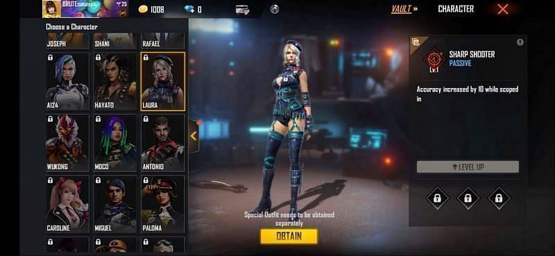 Laura increases the accuracy of players when they are scoped in. The accuracy is increased by 10% at the initial level and gradually rises up to 35% in the final level. It costs 8000 gold coins to buy her.