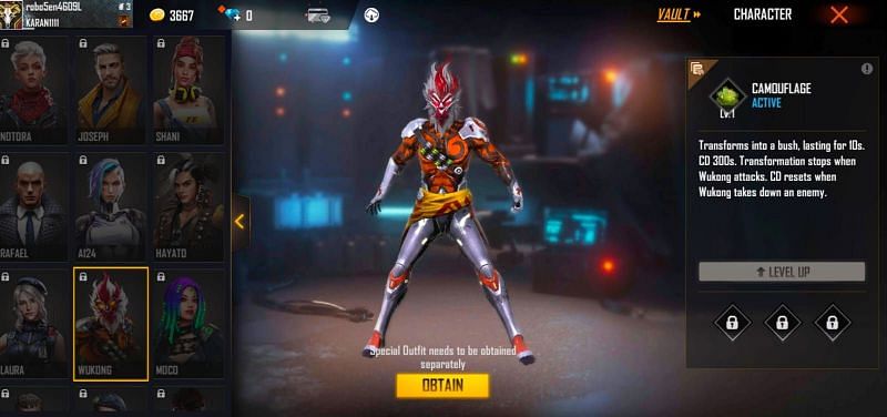 Free Fire's the Monkey King, Wukong, is a fan-favorite. He has an active ability named Camouflage, which turns him into a bush, making him an excellent choice in Free Fire.