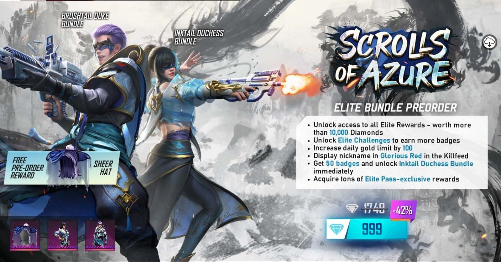 The Free Fire Elite Pass Season 47, Scrolls of Azure, is available for pre-order until March 31. Individuals can pre-order it by spending 999 diamonds on getting a few early benefits and a free pre-order reward, Sheer Hat. As per Garena, players can do the following in the Elite bundle pre-order: