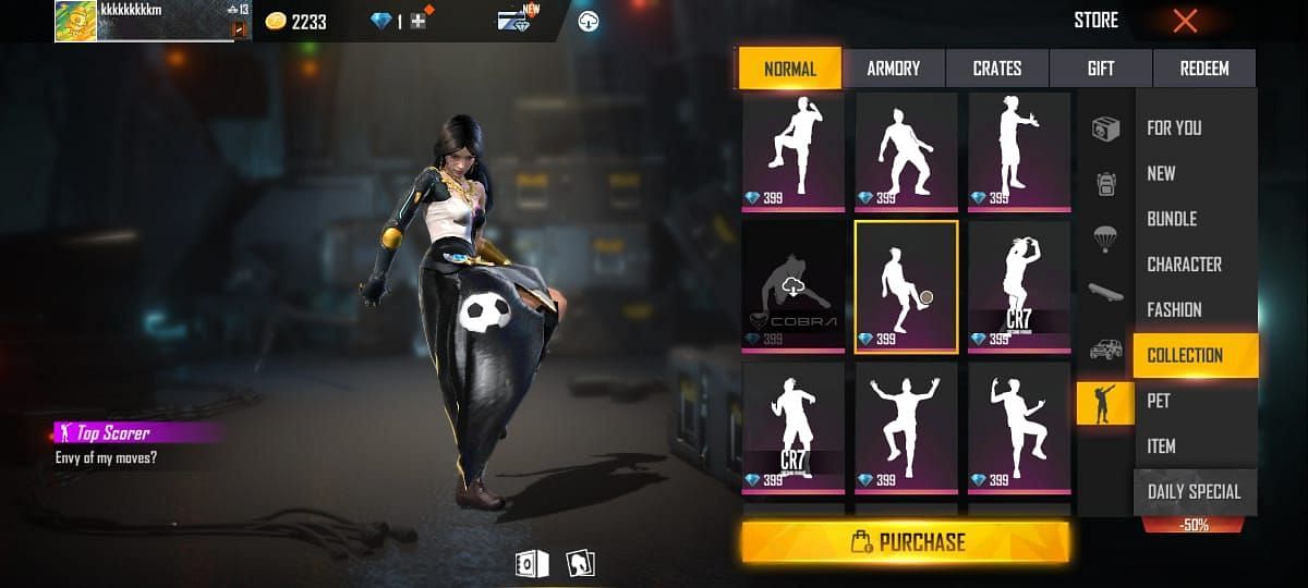 The Top Scorer is a Legendary emote suitable for football lovers. The character does an impressive dribble with an animated football in the emote. Users can get their hands on this legendary emote for 399 diamonds.