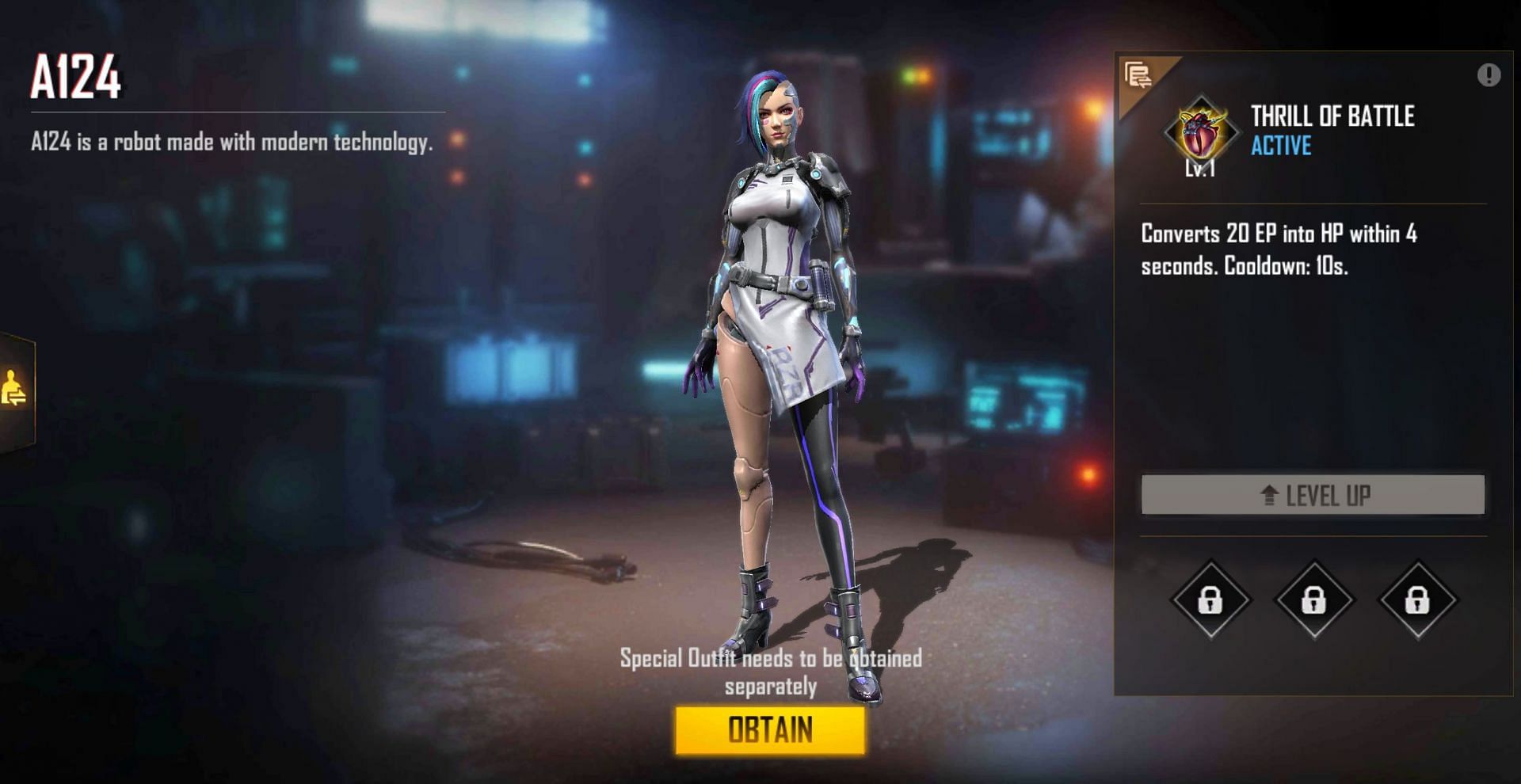 A124 is the ideal option for those looking for a low-cost character. In Free Fire, her particular skill turns 20 EP into HP in 4 seconds, and there's then a 10-second cooldown.