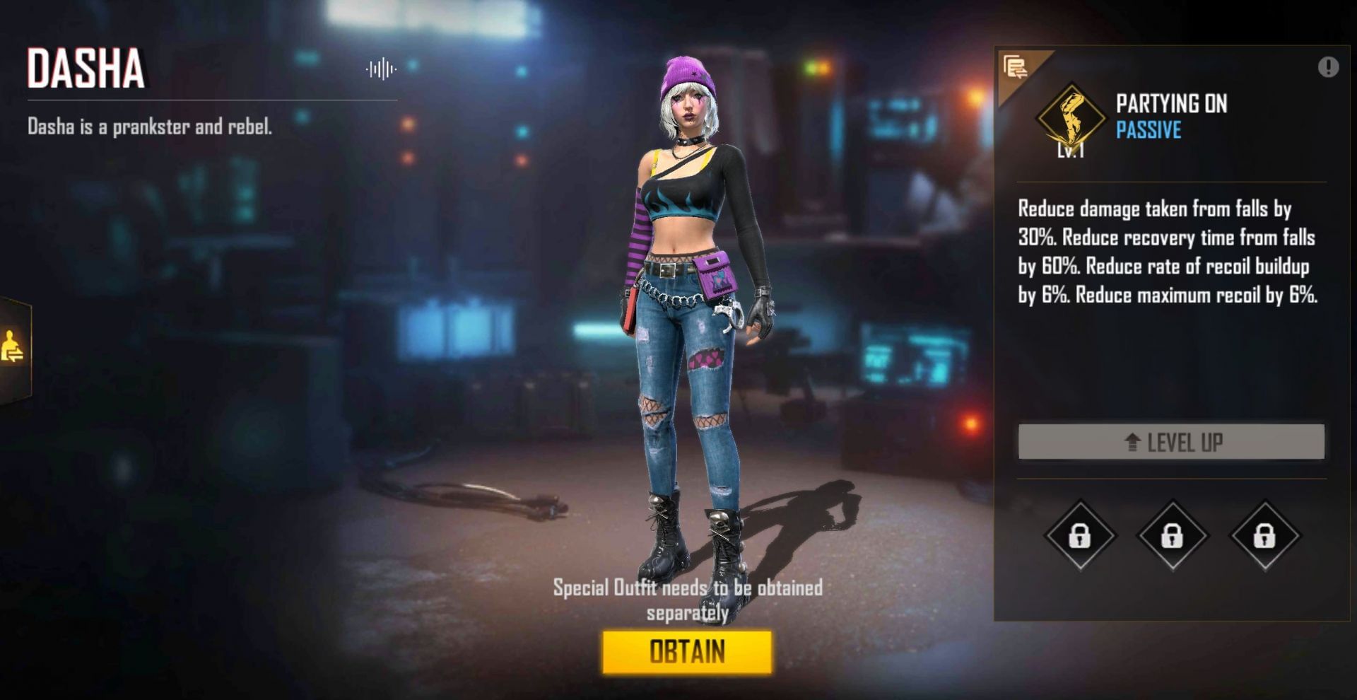 Dasha in Free Fire decreases the damage incurred from falls by 30% and reduces their recovery time by 60%. It further reduces the recoil buildup and maximum recoil rate by 6%.