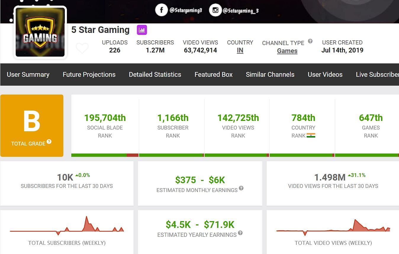 Social Blade estimates 5 Star Gaming’s monthly income to be between $375 and $6K. The earnings for the entire year are projected at around $4.5K and $71.9K.