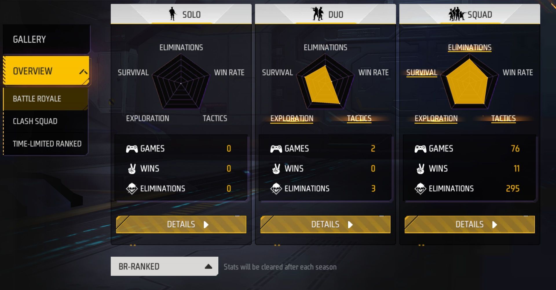 5 Star Gaming has also competed in 76 squad matches in this Free Fire MAX ranked season and has bettered the opposition on 11 occasions, corresponding to a win rate of 14.47%. He has taken down 295 opponents, 111 of which are headshots, adding to a K/D ratio of 4.54 and a headshot rate of 37.63%.