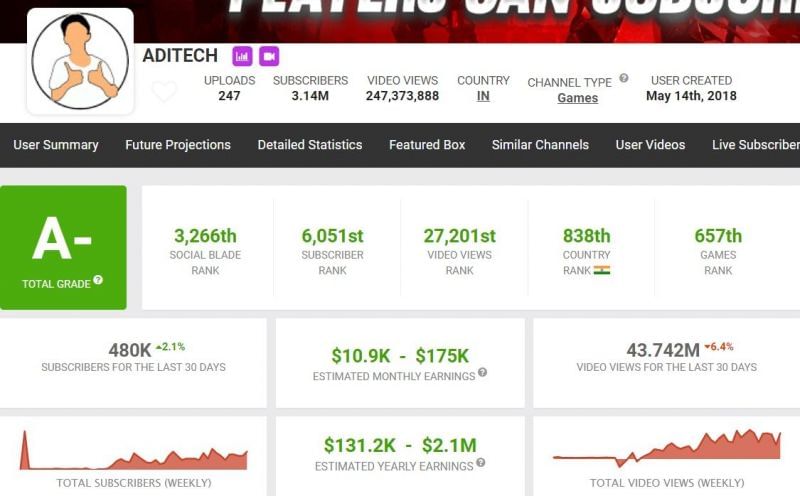 Aditech is expected to earn approximately $10.9K to $175K monthly, with the total yearly earnings adding between $131.2K and $2.1M (Source: Social Blade).