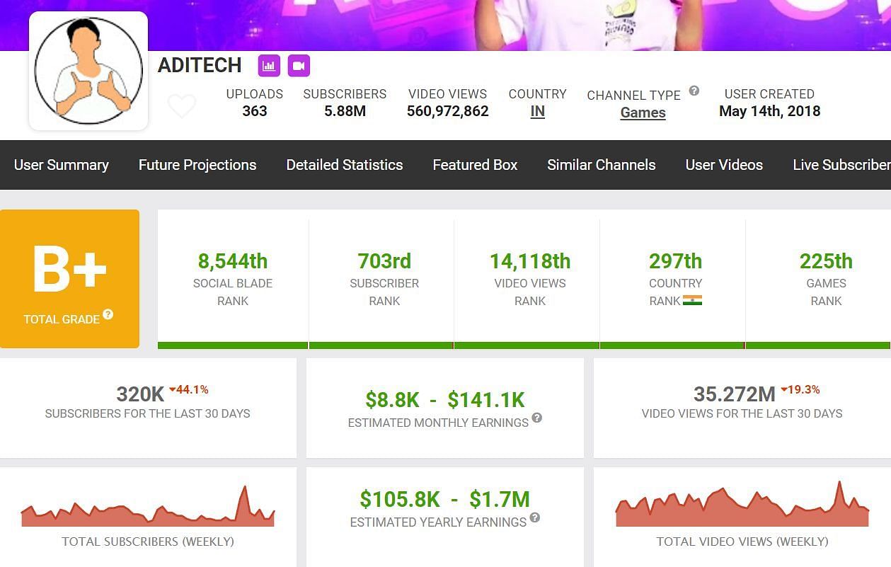 According to Social Blade, Aditech’s monthly income lies between $8.8K and $141.1K.