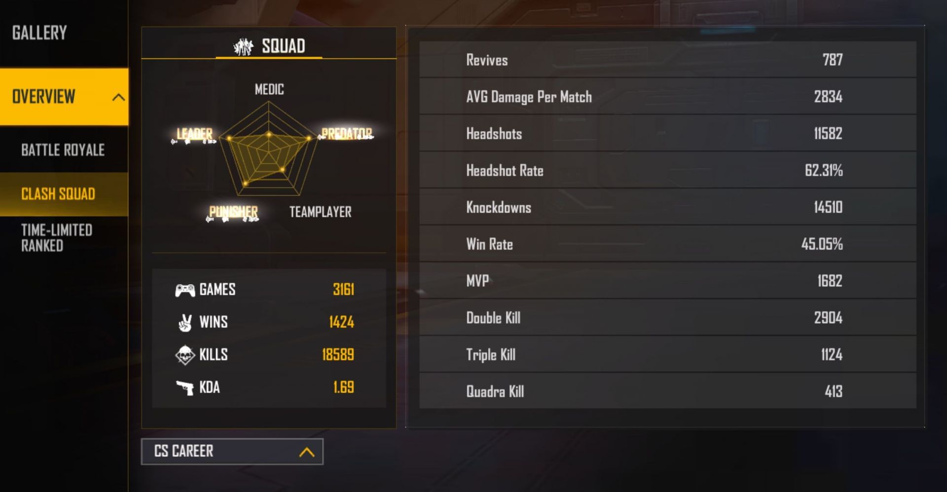 Aditech has played 3161 squad matches in Clash Squad and has 1424 wins, possessing a win percentage of 45.05%. He has 18589 kills at a KDA of 1.69.