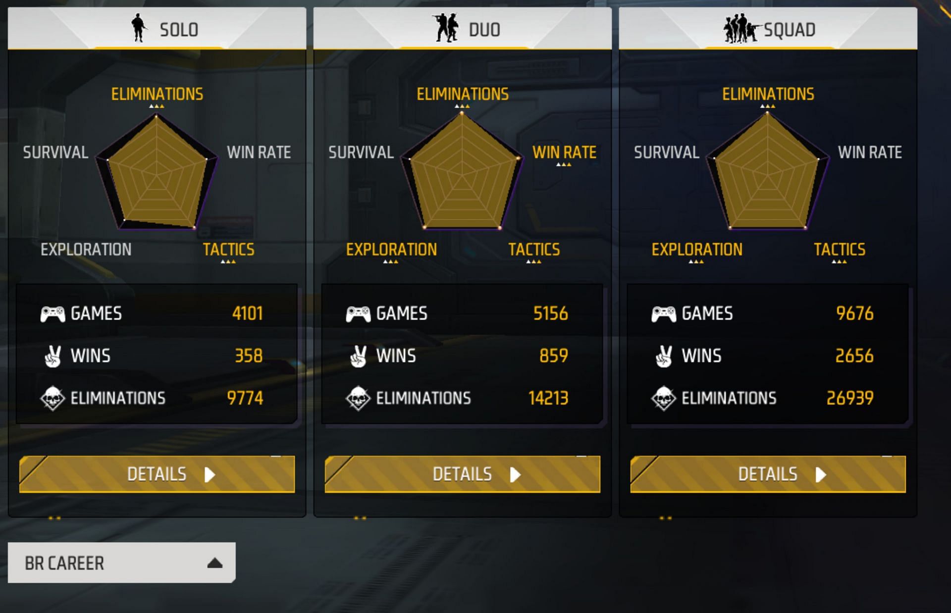 Amitbhai has been a part of 4101 solo matches since the beginning and scored 358 Booyahs, earning him a win rate of 8.72%. He has also recorded 9774 eliminations at a K/D ratio of 2.61.