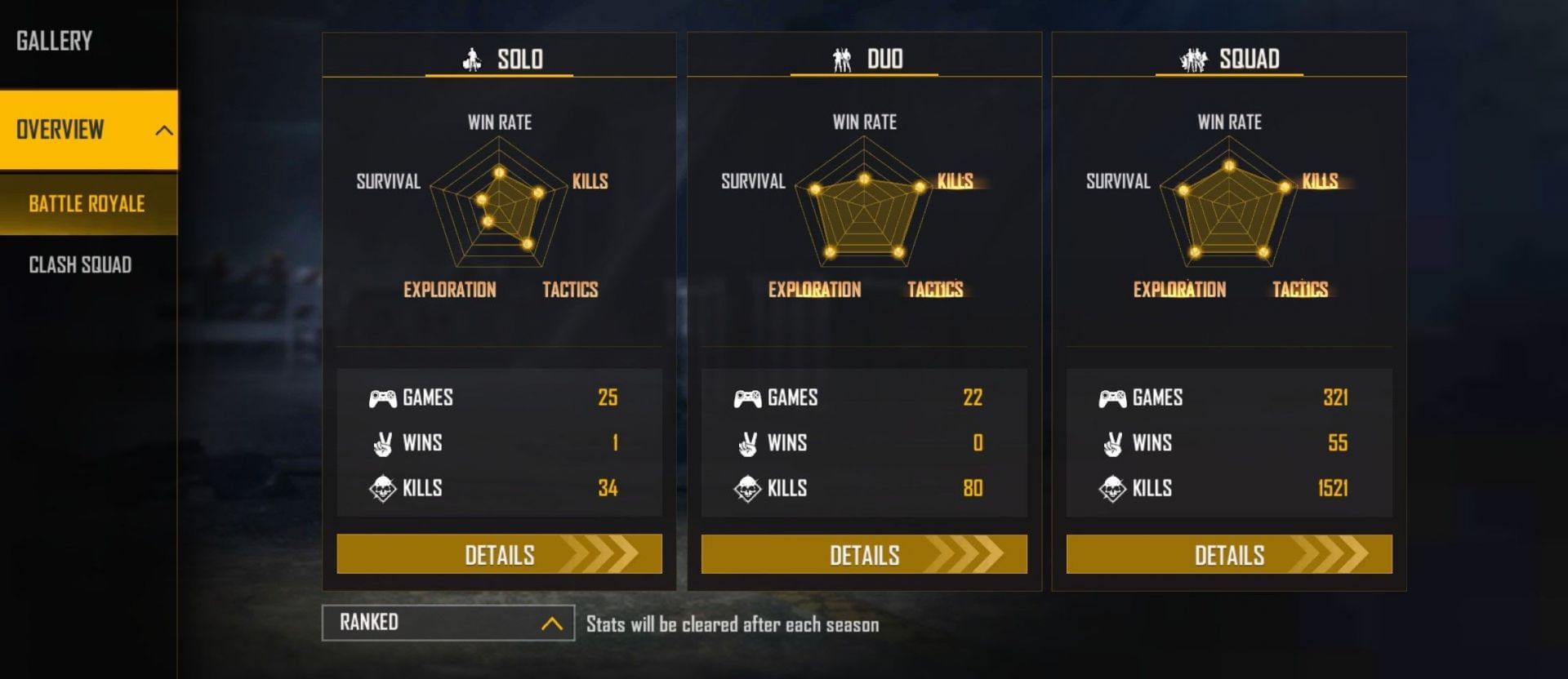 The content creator has played 25 solo matches and has a single victory, ensuring a win rate of 4%. He has bagged 34 kills with a K/D ratio of 1.42.