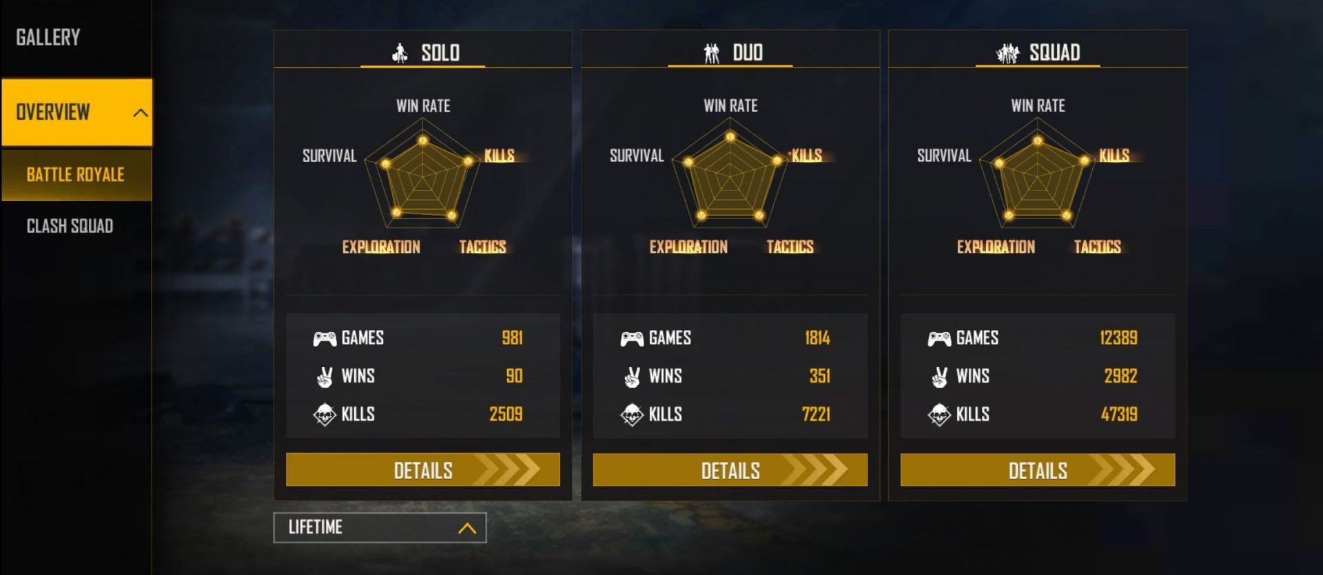 Ajjubhai has played 981 solo matches and bettered his opponents on 90 occasions, converting in a win ratio of 9.17%. He has notched 2509 kills with a K/D ratio of 2.82.