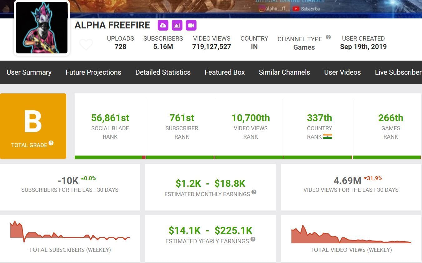 Social Blade estimates Alpha FF’s monthly earnings to be $1.2K and $18.8K. The yearly income with the present level of viewership is approximately around $14.1K - $225.1K.