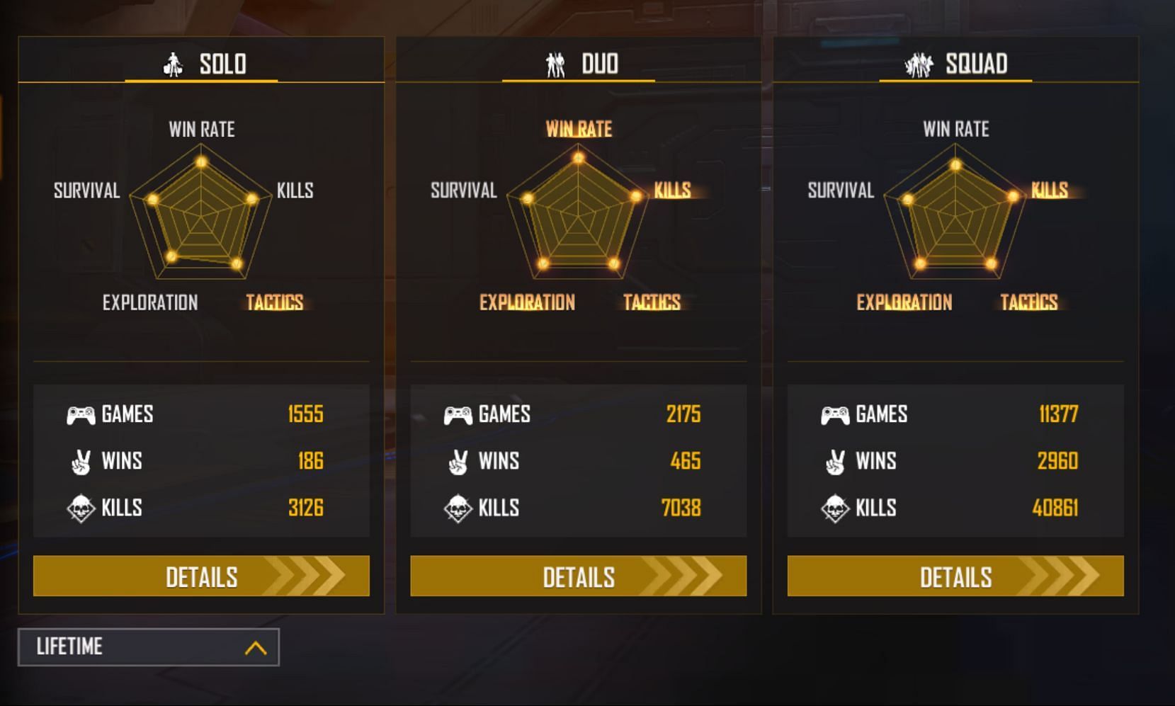 Amitbhai has played 3883 solo matches and managed to secure 327 victories, roughly equating to a win rate of 8.42%. With 9158 eliminations in the mode, he has earned himself a K/D ratio of 2.58.